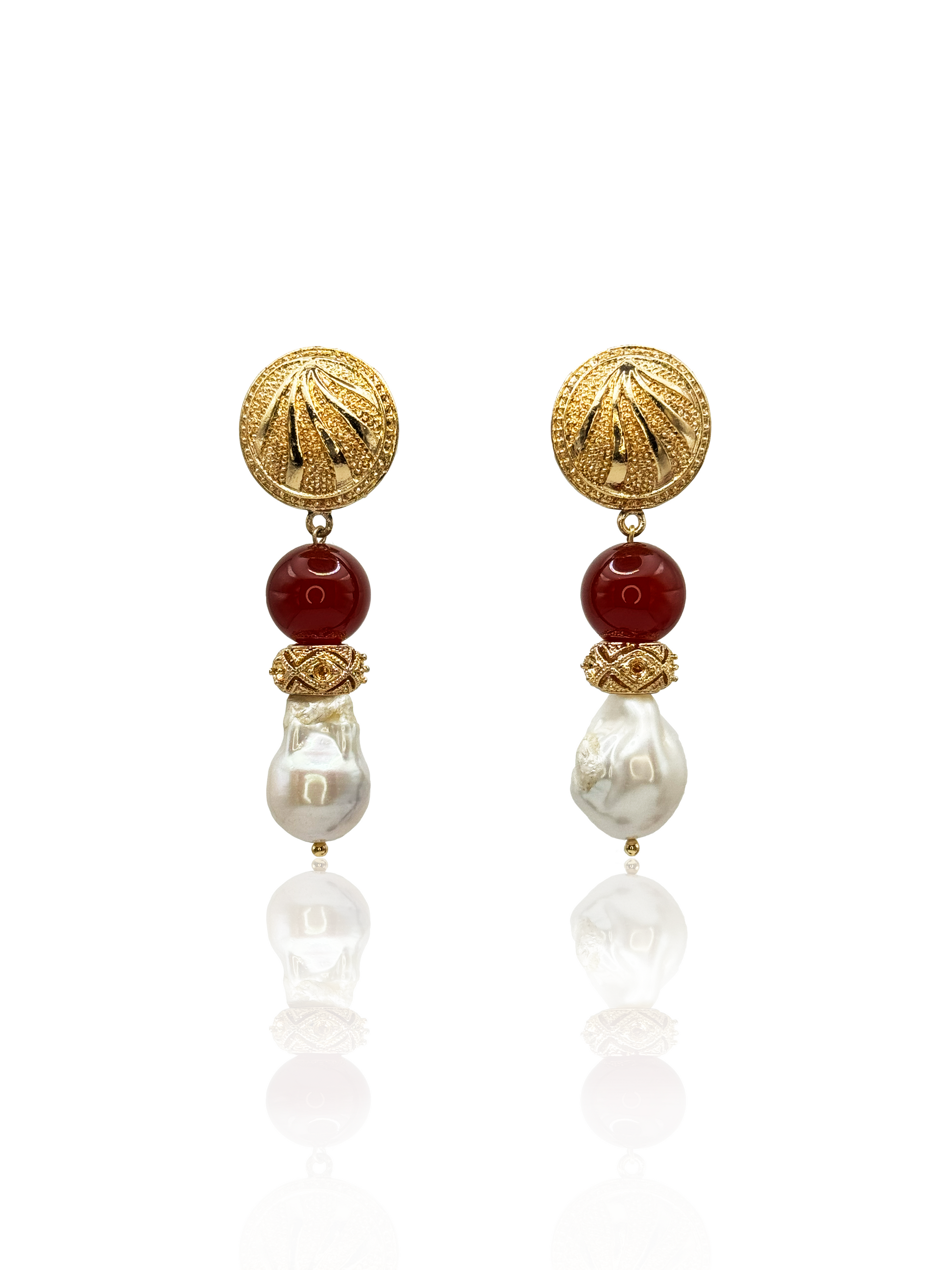 Baroque Pearl Drop Earrings With Burgundy Carnelian Gemstone
