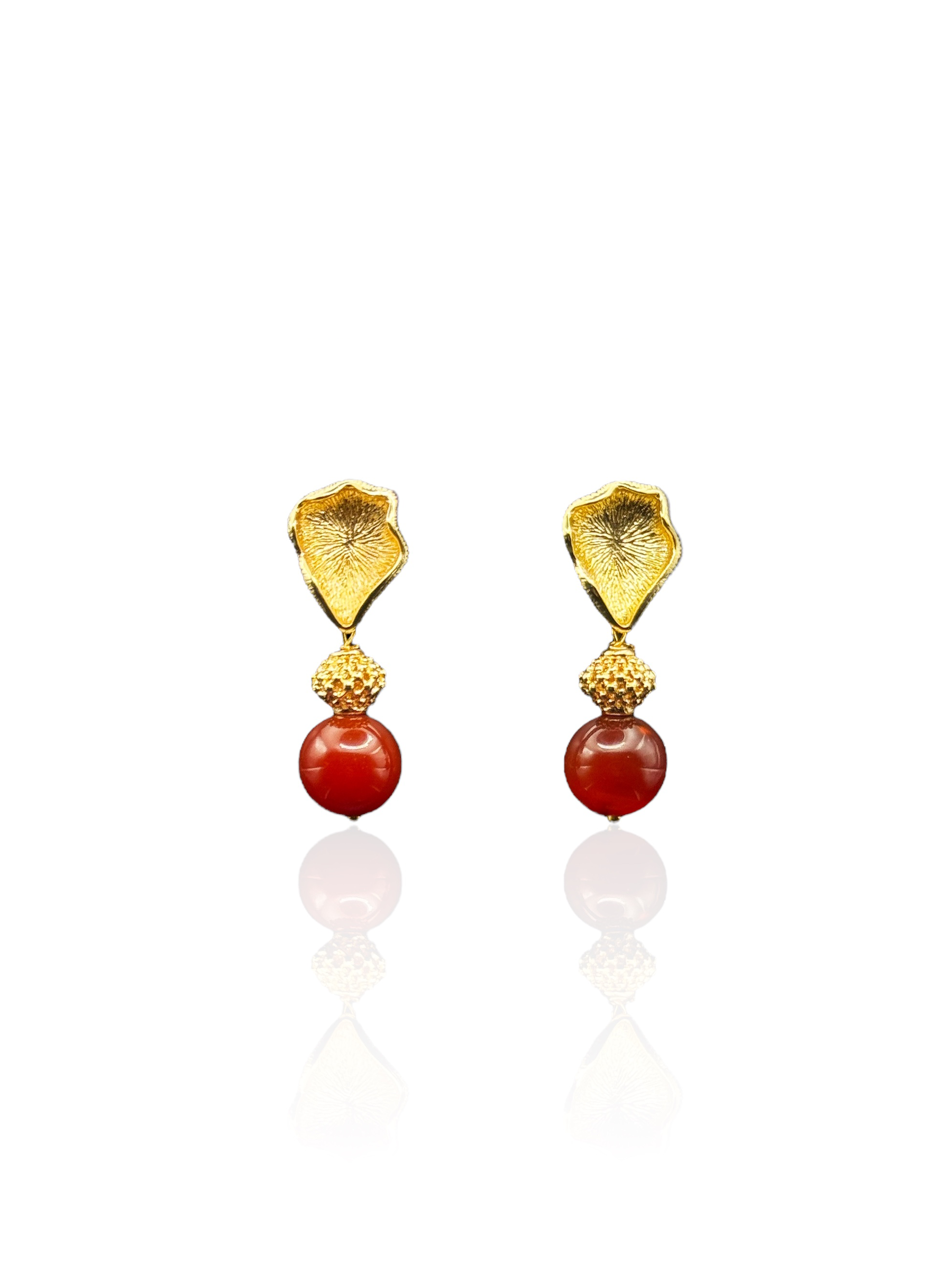 Gorgeous drop earrings with gold-plated top and red carnelian gemstone.