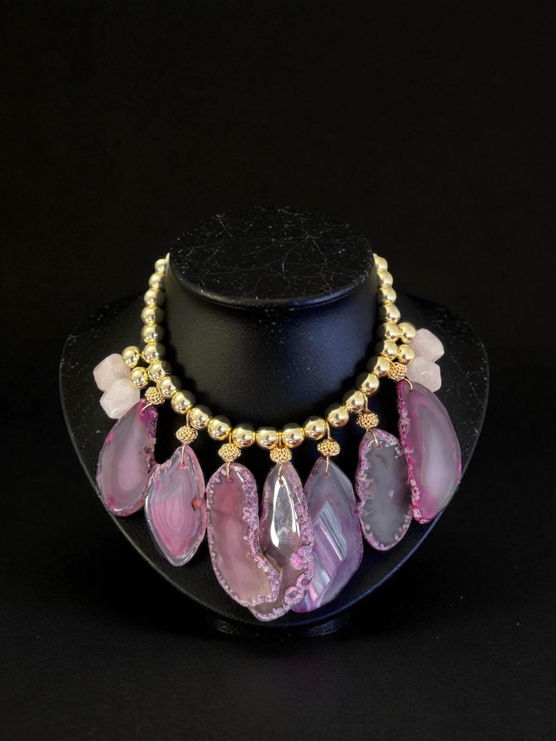 Gold-plated Hematite Statement Necklace With Lilac Agates & Rose Quartz.
