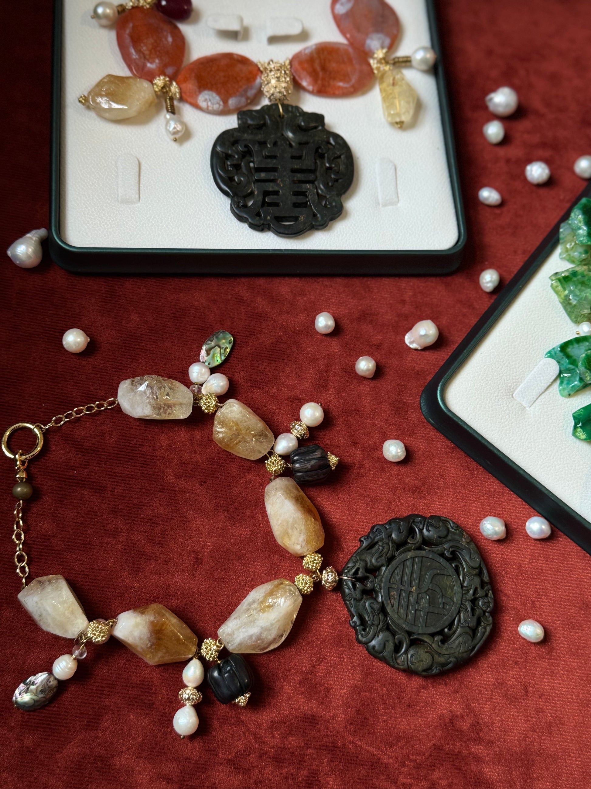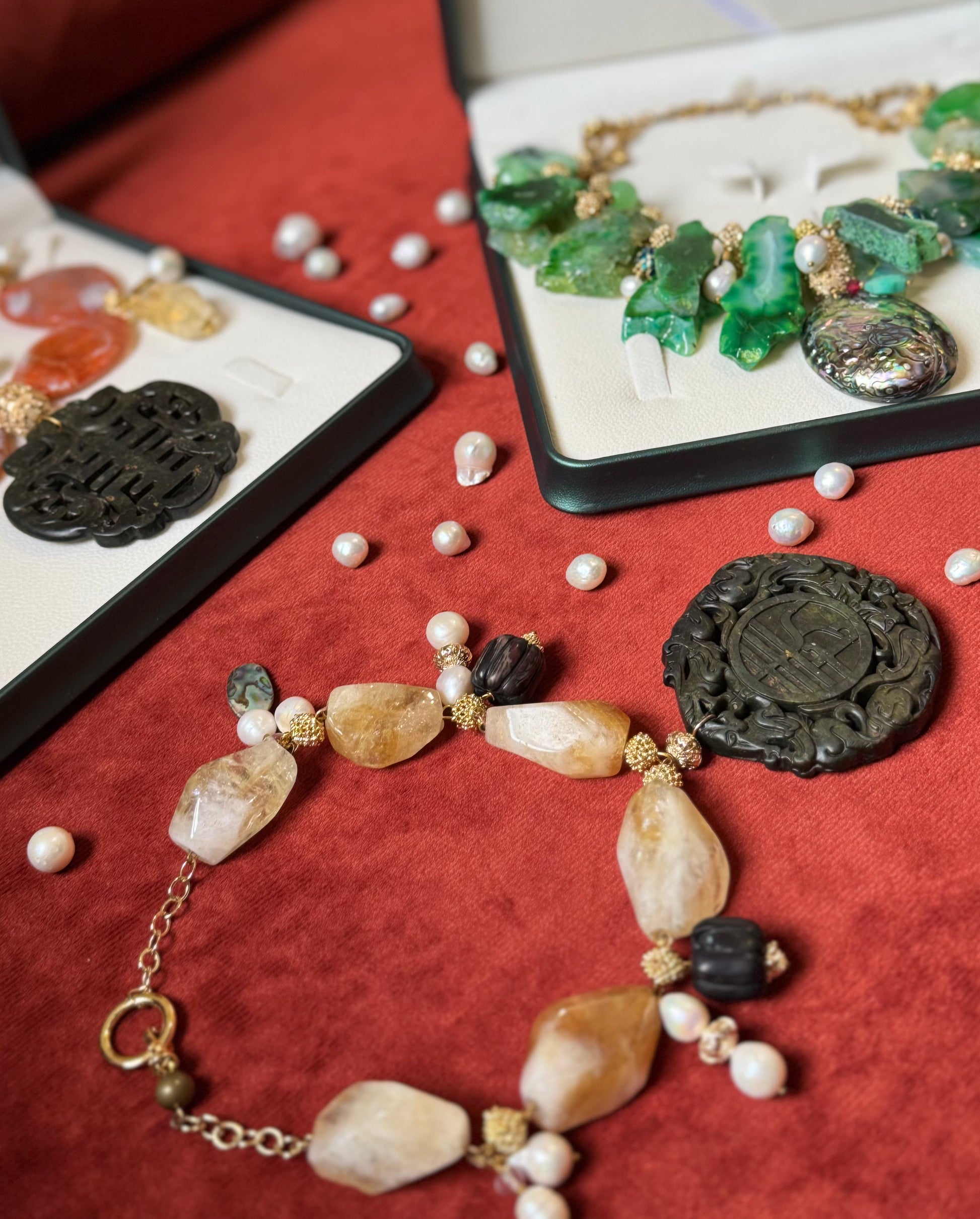 Handcrafted Citrine and Jade Gemstone Statement Necklace with Pearls and Abalone. Handcrafted in London in small batches