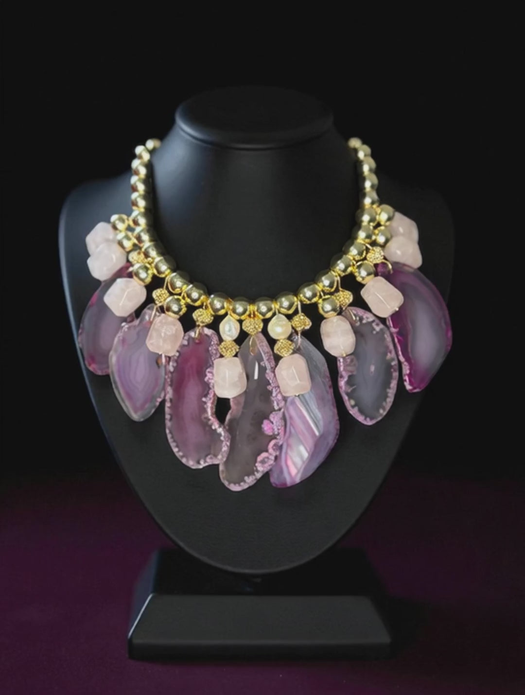 Lilac Agate Statement Necklace With Rose Quartz & Gold-Plated Hematite